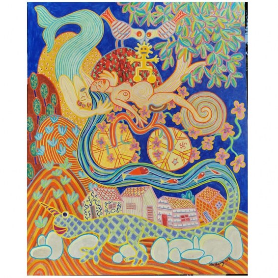 En esta pintura tenía como referente un sueño de la comuna de La Reina, donde aún domina la casa versus edificios en altura, donde la cordillera está siempre presente y nos marca el tiempo y la hora, desde lo alto los árboles y el verde dominan la vista, donde los vecinos cuidan ellos mismos sus jardines y la vegetación pública, donde abunda una cantidad de aves increíbles, pero también las silenciosas lagartijas entre las piedras del cerro, en un clima mediterráneo. El cielo se confunde con el agua. La bicicleta mueve la vida o viceversa, el amor al humano y al medio ambiente van a dar a luz frondosos árboles.