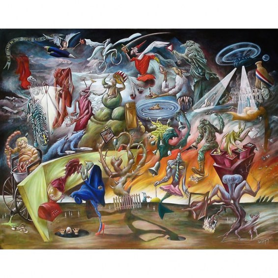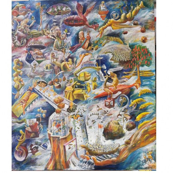 O Crítica a las aberraciones del Establecimiento. Este óleo lleva como título “La pasión de Joel según San César”, pues me inspiré en un verso de mi amigo Joel Muñoz (QEPD), quién hace 30 años pasaba por una profunda crisis emocional, política y financiera, lo que le dio material para plasmar esos expresivos versos en papel. A partir de eso hice mi propio relato/poesía gráfica o pictográfica. De él tengo un relato que se puede ver en video.